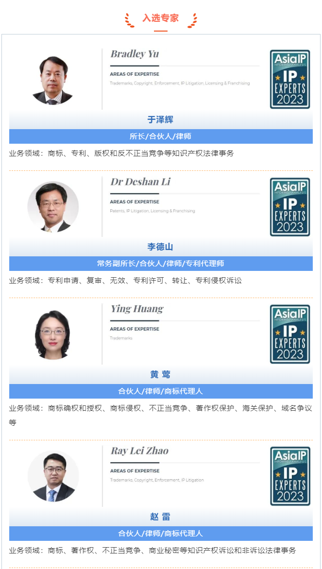 >龙珠直播>关于我们>荣誉概览>2024>集佳5位合伙人入选Asia IP 2023年度“中国知识产权专家百强榜”